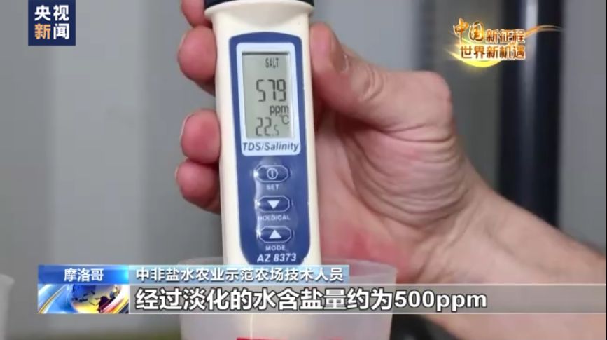 中非鹽水農(nong) 業(ye) 示範農(nong) 場技術人員:經過淡化的水含鹽量約為(wei) 500ppm,而淡化之前,地下水的原本含鹽量可以看到是稍高於(yu) 4000ppm。這真是太了不起了。