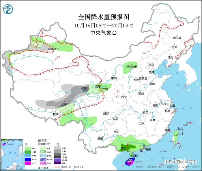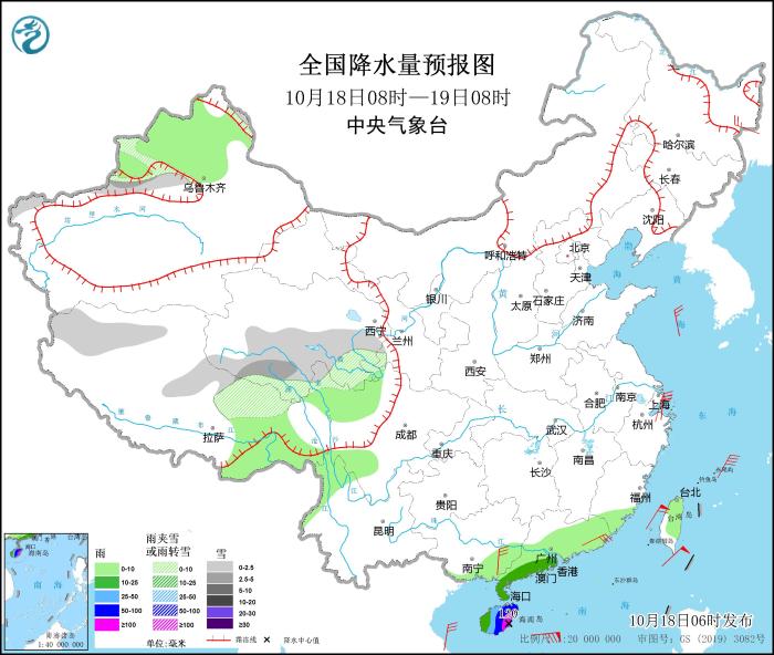 10月18日08時至19日08時,新疆沿天山地區、西藏北部和西部、青海東(dong) 部和南部等地部分地區有小到中雪或雨夾雪。廣東(dong) 西南部、海南島等地部分地區有中到大雨,其中,海南島中東(dong) 部部分地區有暴雨或大暴雨(100~120毫米)。黑龍江東(dong) 北部、廣西東(dong) 南部、廣東(dong) 東(dong) 南部沿海等地部分地區有4~6級風;台灣海峽、南海北部和中西部偏北海域的風力可達10~11級、陣風12~13級,台風中心經過的附近海域風力可達12~14級、陣風15~16級。