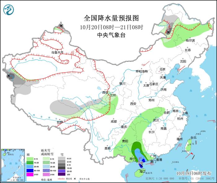 10月20日08時至21日08時,內(nei) 蒙古東(dong) 北部、新疆北疆北部和南疆盆地、西藏東(dong) 北部、青海南部等地部分地區有小到中雪,其中,內(nei) 蒙古東(dong) 北部、新疆北疆北部和南疆西部山區等地部分地區有大雪(5~8毫米)。廣西東(dong) 部、廣東(dong) 西南部等地部分地區有中到大雨,其中,廣東(dong) 西南部等地部分地區有暴雨(50~90毫米)。遼東(dong) 半島、廣西東(dong) 南部沿海等地部分地區有4~6級風,其中,新疆東(dong) 部部分地區有6~7級風。