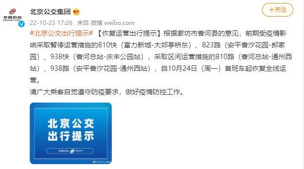 中新網10月23日電 北京公交集團23日發布恢複運營出行提示稱,根據廊坊市香河縣的意見,前期受疫情影響采取暫停運營措施的810快(富力新城-大郊亭橋東(dong) )、823路(安平香汐花園-郎家園)、938快(香河總站-慶豐(feng) 公園站),采取區間運營措施的810路(香河總站-通州西站)、938路(安平香汐花園-通州西站),自10月24日(周一)首班車起恢複全線運營。(中新財經)