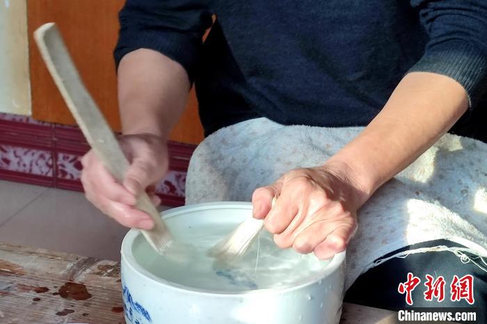 在水中反複梳洗毛筆頭是製筆的重要環節。 吳冠標 攝