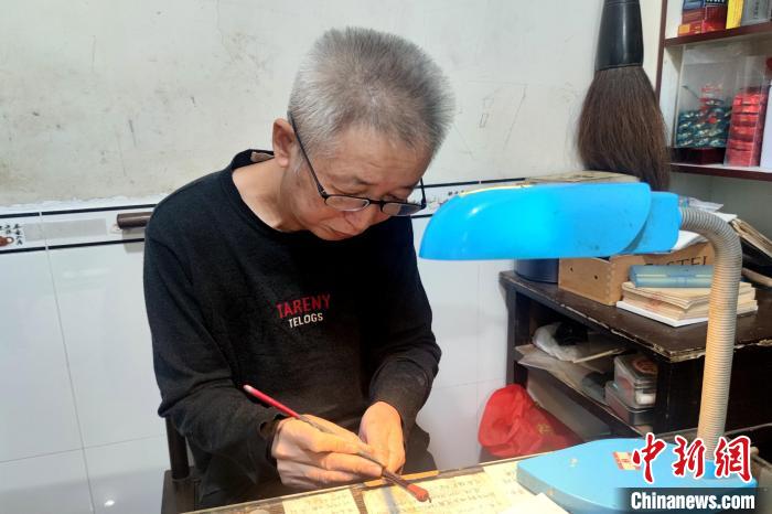 藍田張氏毛筆製作技藝非遺傳(chuan) 承人張才枝在為(wei) 剛做好的毛筆刻字。 吳冠標 攝
