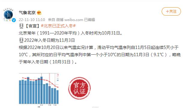 中新網11月10日電 據北京市氣象局官方微博消息,北京常年(1991—2020年平均)入冬時間為(wei) 10月31日,2022年入冬日期為(wei) 11月3日。