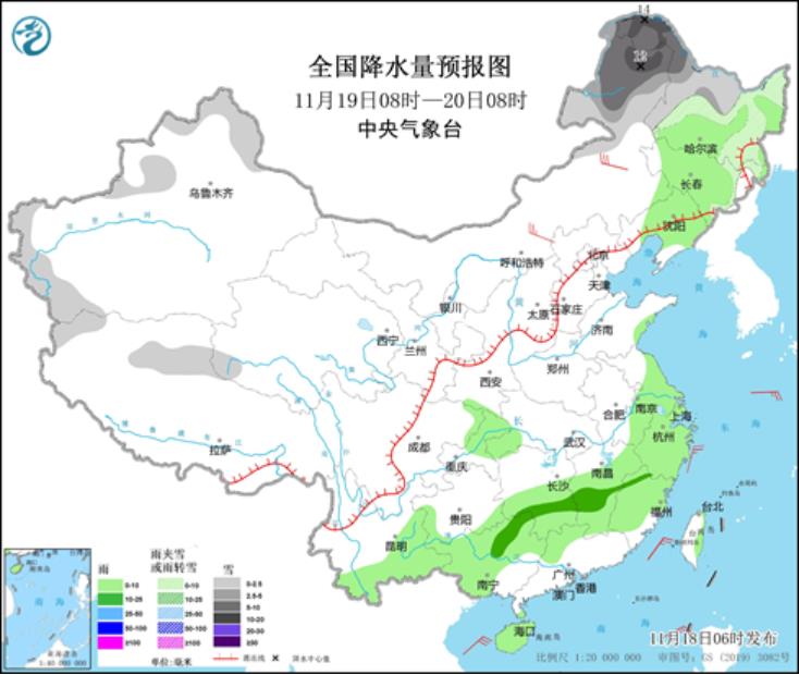 11月19日08時至20日08時,內(nei) 蒙古東(dong) 北部、黑龍江北部、新疆北疆北部等地部分地區有小到中雪或雨夾雪,其中,內(nei) 蒙古東(dong) 北部、黑龍江西北部有大到暴雪(10~12毫米)。東(dong) 北地區大部、江淮東(dong) 部、江南東(dong) 部和南部、雲(yun) 南南部、華南西部、海南島等地部分地區有小雨。內(nei) 蒙古中東(dong) 部部分地區有4~5級風(見圖3)。