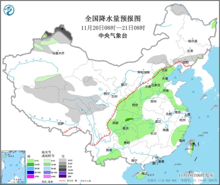 11月20日08時至21日08時,新疆北疆和南部、西藏北部、青海南部和西部等地部分地區有小到中雪或雨夾雪,其中,新疆北疆有大到暴雪(10~19毫米)。東(dong) 北地區大部、江南東(dong) 部和南部、雲(yun) 南南部、華南西部、海南島等地部分地區有小到中雨。(見圖4)。