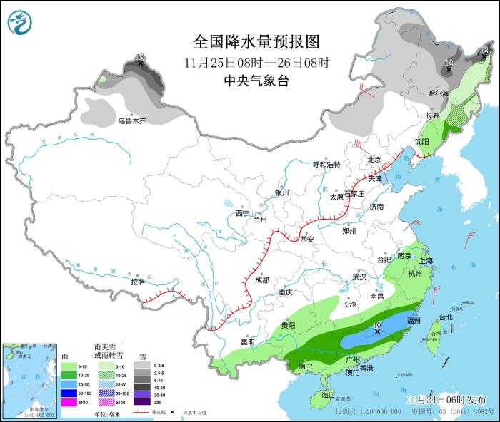11月25日08時至26日08時,內(nei) 蒙古東(dong) 部、東(dong) 北地區中北部、新疆北部等地部分地區有小到中雪或雨夾雪,其中,黑龍江東(dong) 北部和中部、新疆阿勒泰山區等地部分地區有大到暴雪(10~18毫米)。吉林東(dong) 南部、遼寧東(dong) 部、江南東(dong) 部和南部、貴州南部、雲(yun) 南南部、華南、台灣島等地部分地區有小到中雨,其中,江西南部、福建中南部、廣東(dong) 北部等地部分地區有大雨(25~40毫米)。內(nei) 蒙古中部部分地區有4~6級風,其中,河北北部部分地區有6~7級風(見圖2)。