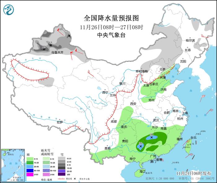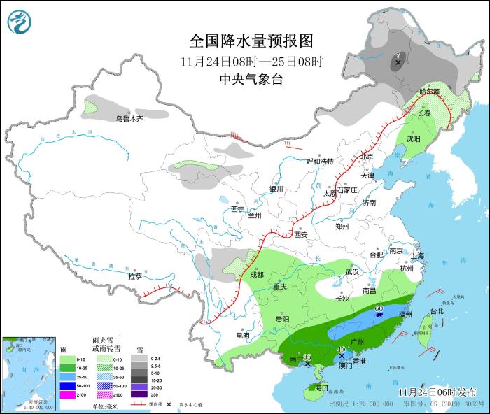 11月24日08時至25日08時,內(nei) 蒙古東(dong) 部、東(dong) 北地區、新疆沿天山地區、甘肅河西、川西高原等地部分地區有小到中雪或雨夾雪,其中,內(nei) 蒙古東(dong) 北部局地有大雪(5~7毫米)。江南南部、華南大部等地部分地區有中到大雨,局地暴雨(50~60毫米)。內(nei) 蒙古西部部分地區有5~7級風(見圖1)。