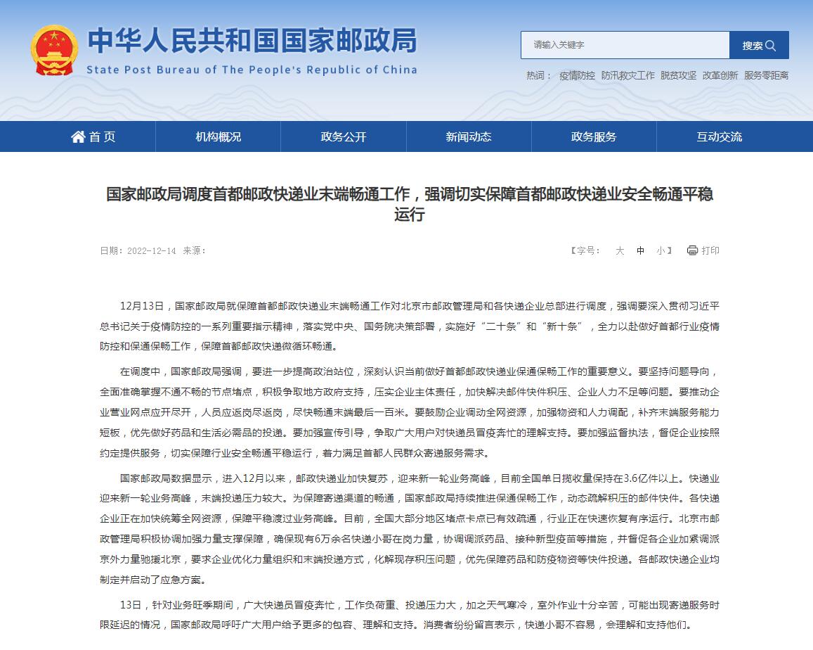 中新網12月14日電 據國家郵政局網站14日消息,13日,國家郵政局就保障首都郵政快遞業(ye) 末端暢通工作對北京市郵政管理局和各快遞企業(ye) 總部進行調度,強調實施好“二十條”和“新十條”,全力以赴做好首都行業(ye) 疫情防控和保通保暢工作,保障首都郵政快遞微循環暢通。