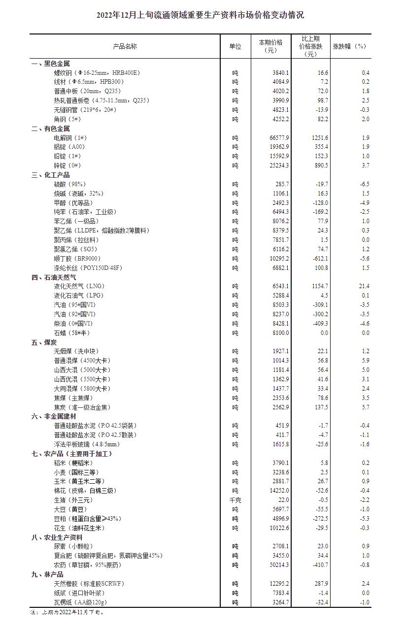 中新網12月14日電 國家統計局網站12月14日公布2022年12月上旬流通領域重要生產(chan) 資料市場價(jia) 格變動情況。據對全國流通領域9大類50種重要生產(chan) 資料市場價(jia) 格的監測顯示,2022年12月上旬與(yu) 11月下旬相比,29種產(chan) 品價(jia) 格上漲,18種下降,3種持平。其中,生豬(外三元)價(jia) 格為(wei) 22.0元/千克,環比下降2.2%。(中新財經)