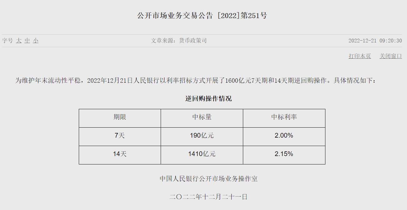 中新網12月21日電 據央行官網消息,為(wei) 維護年末流動性平穩,2022年12月21日人民銀行以利率招標方式開展了1600億(yi) 元7天期和14天期逆回購操作。中標利率分別為(wei) 2.00%和2.15%。(中新財經)
