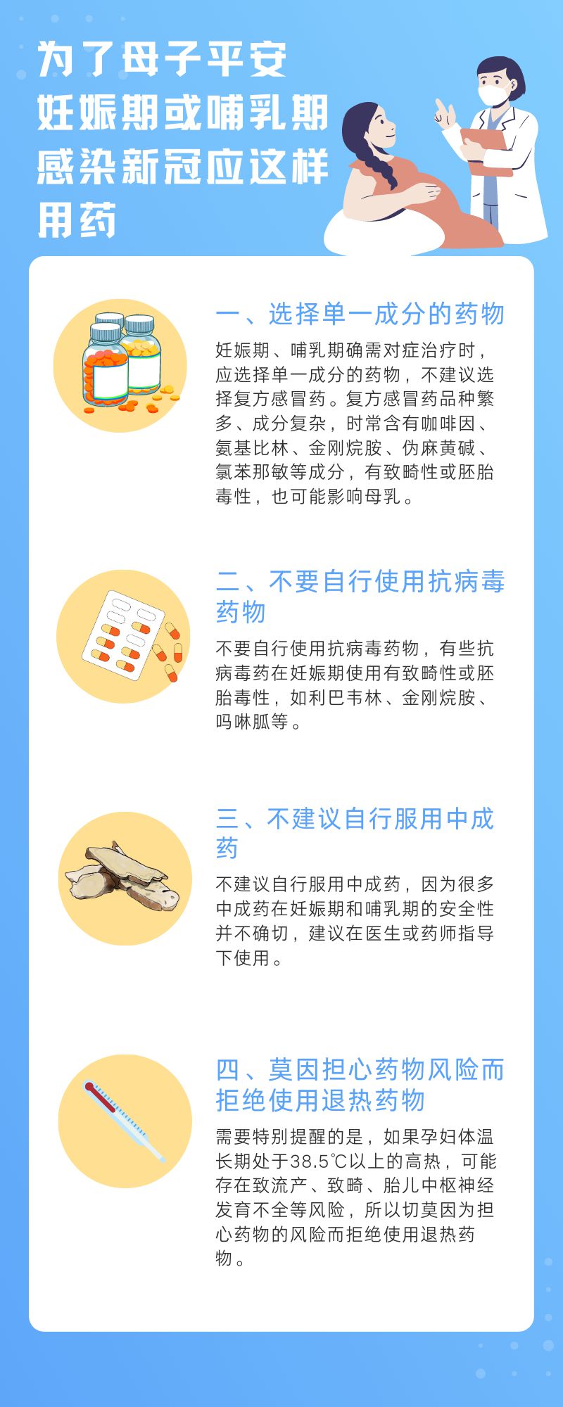 妊娠期、哺乳期的新冠病毒感染者用藥若不科學,可能直接危害寶寶健康,但媽媽們(men) 若是“硬扛”著不用藥,高燒等症狀也會(hui) 影響胎兒(er) 發育和哺乳。對此,陸軍(jun) 軍(jun) 醫大學陸軍(jun) 特色醫學中心藥劑科專(zhuan) 家為(wei) “準媽媽”和哺乳期媽媽整理出了新冠用藥指南。
