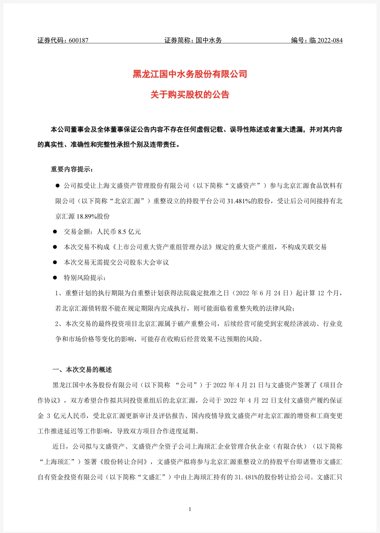 中新網12月28日電 國中水務12月27日發布公告,擬受讓上海文盛資產(chan) 管理股份有限公司(以下簡稱“文盛資產(chan) ”)參與(yu) 北京匯源食品飲料有限公司(以下簡稱“北京匯源”)重整設立的持股平台公司31.481%的股份,受讓後公司間接持有北京匯源18.89%股份,交易金額為(wei) 人民幣8.5億(yi) 元。