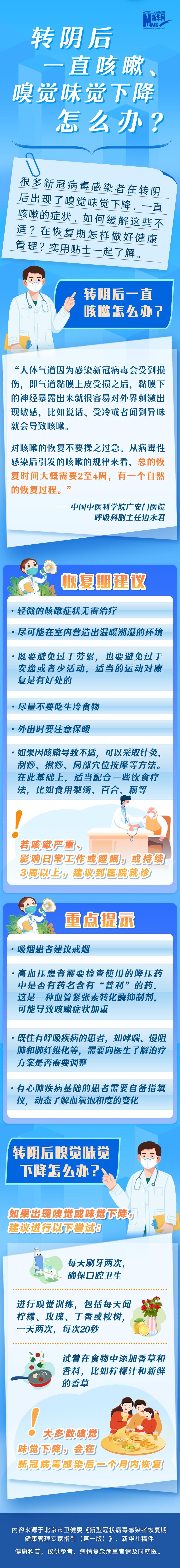 很多新冠病毒感染者在轉陰後出現了嗅覺味覺下降、一直咳嗽的症狀,如何緩解這些不適?在恢複期怎樣做好健康管理?實用貼士一起了解。