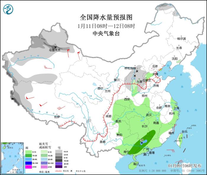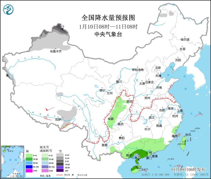 1月9日08時至10日08時,新疆北部和西部山區、西藏西部等地部分地區有小到中雪,其中,新疆北疆北部、西藏西部局地有大到暴雪(10~18毫米)。江南中南部、華南大部、台灣島等地部分地區有小到中雨,其中,廣東(dong) 東(dong) 北部和西南部沿海、海南島北部等地局地有大雨(25~45毫米)。西藏中西部等地部分地區有5~7級風(見圖1)。