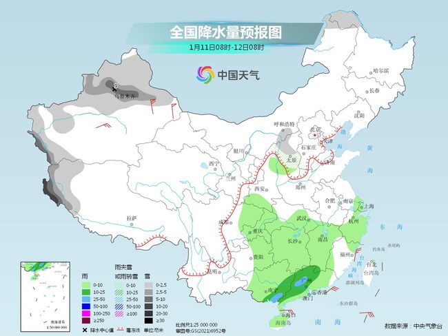 明天,隨著補充弱冷空氣南下,暖濕氣流增強,我國中東(dong) 部雨雪天氣將增多,其中黑龍江西北部、新疆北部和西部山區、西藏西部、陝西北部、山西中北部等地部分地區有小到中雪或雨夾雪,其中,新疆沿天山地區、西藏西部等地局地有大到暴雪。江漢南部、江南大部、西南地區東(dong) 部、華南等地部分地區有小到中雨,局地有大雨。