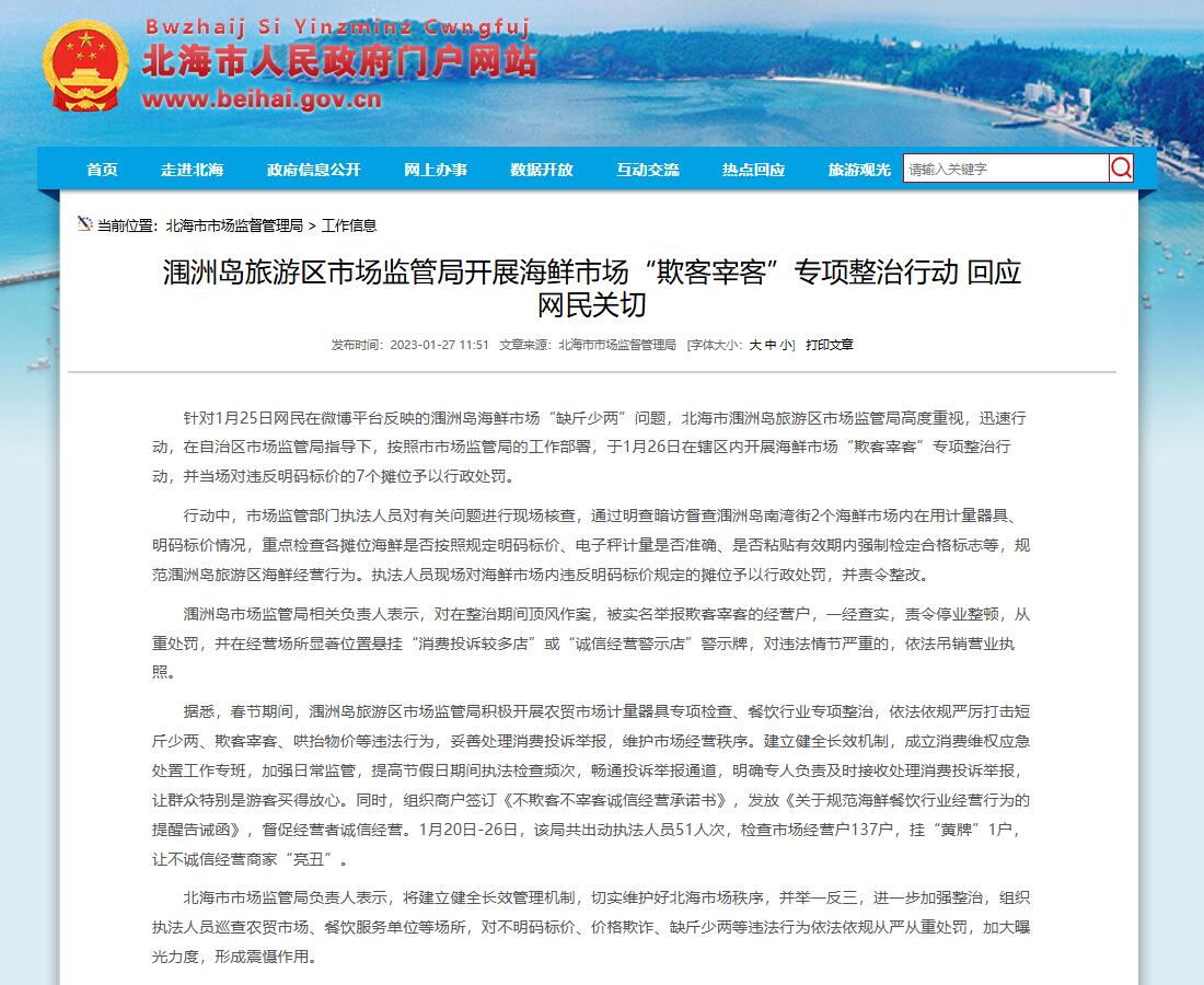 中新網1月28日電 據北海市市場監督管理局網站27日消息,針對1月25日網民在微博平台反映的潿洲島海鮮市場“缺斤少兩(liang) ”問題,北海市潿洲島旅遊區市場監管局高度重視,迅速行動,在自治區市場監管局指導下,按照市市場監管局的工作部署,於(yu) 1月26日在轄區內(nei) 開展海鮮市場“欺客宰客”專(zhuan) 項整治行動,並當場對違反明碼標價(jia) 的7個(ge) 攤位予以行政處罰。