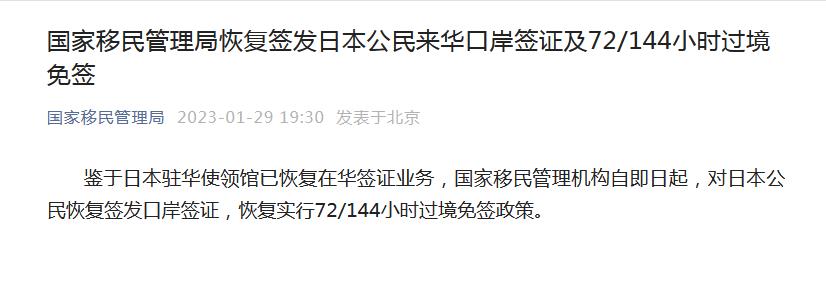 中新網1月29日電 據國家移民管理局微信公眾(zhong) 號消息,鑒於(yu) 日本駐華使領館已恢複在華簽證業(ye) 務,國家移民管理機構自即日起,對日本公民恢複簽發口岸簽證,恢複實行72/144小時過境免簽政策。