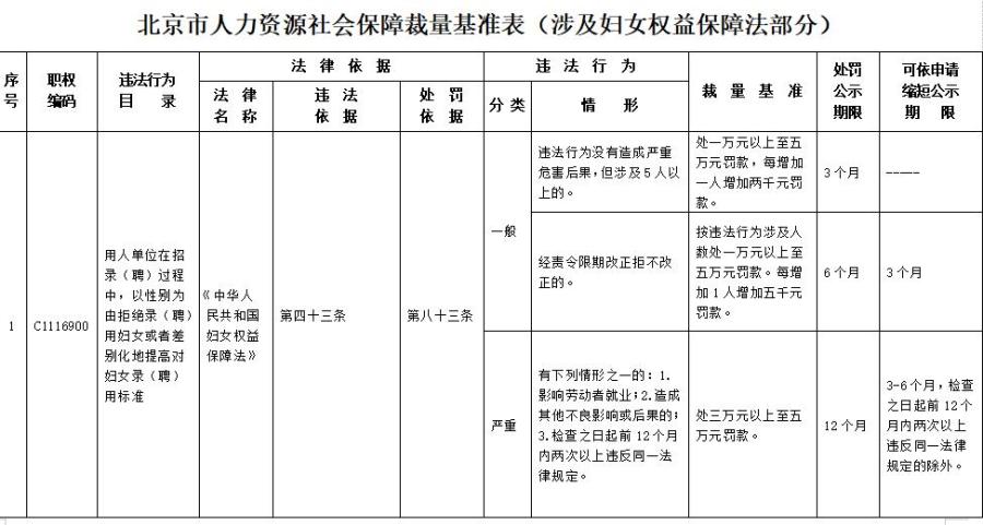 中新網2月3日電 北京市人力資源和社會(hui) 保障局近日發布關(guan) 於(yu) 印發《北京市人力資源社會(hui) 保障行政處罰裁量基準表(涉及婦女權益保障法部分)》的通知,其中明確,用人單位在招錄(聘)過程中,以性別為(wei) 由拒絕錄(聘)用婦女或者差別化地提高對婦女錄(聘)用標準,或因結婚、懷孕、產(chan) 假、哺乳等,降低女職工的工資和福利待遇等行為(wei) ,最高可處五萬(wan) 元罰款。(中新財經)