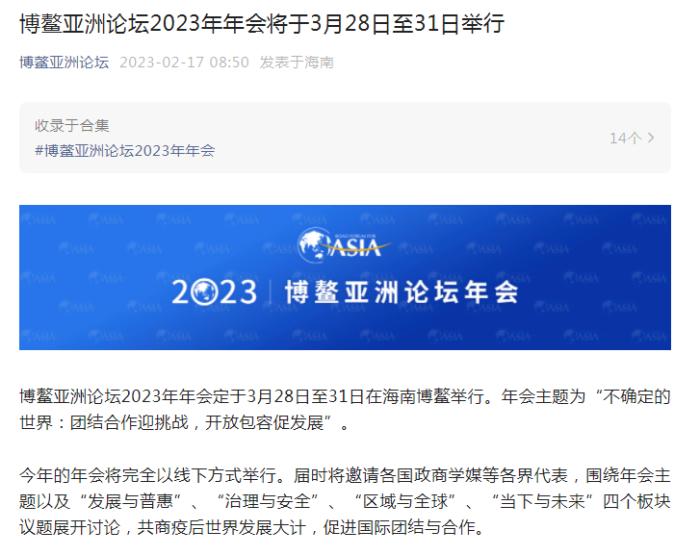 博鼇亞洲論壇2023年年會將於3月28日至31日舉行