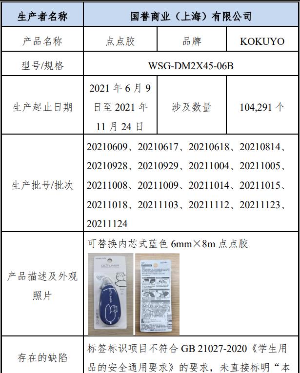 中新網2月20日電 據上海市場監管微信公眾(zhong) 號20日消息,國譽商業(ye) (上海)有限公司自2023年2月20日至2023年5月19日,召回2021年6月9日至2021年11月24日生產(chan) 的20210609等17個(ge) 批號;型號為(wei) WSG-DM2X45-06B的“KOKUYO”點點膠,涉及104,291個(ge) 。