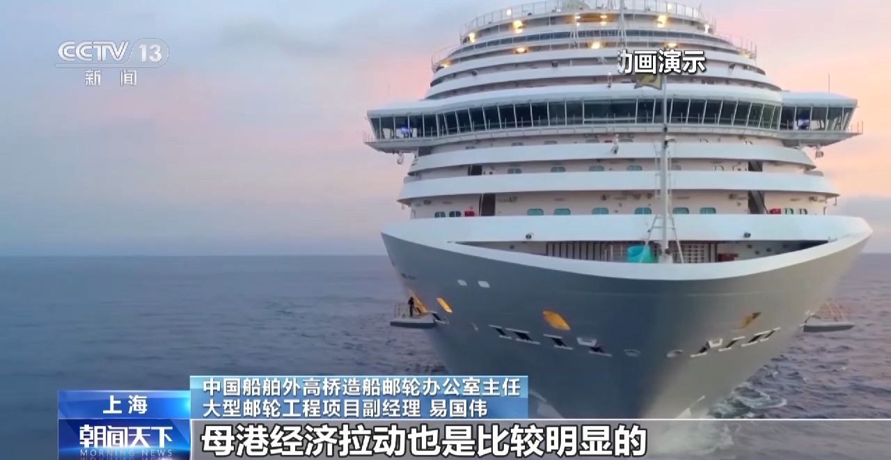 中國船舶外高橋造船郵輪辦公室主任 大型郵輪工程項目副經理 易國偉(wei) :顧客在登船和下船以後,在當地也會(hui) 進行對應的消費和娛樂(le) ,所以對當地港口的母港經濟拉動也是比較明顯的。中國的郵輪產(chan) 業(ye) 如果按照正常的發展速度,預估在2035年可以達到一年5000億(yi) 元的產(chan) 值。
