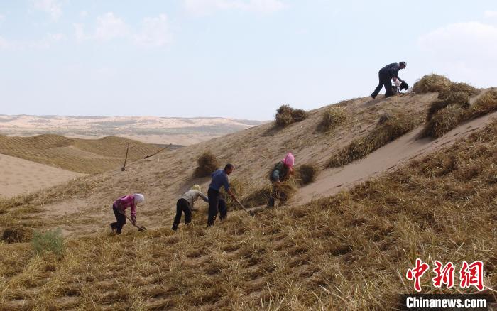 白芨灘林場員工紮麥草方格進行治沙(資料圖)。 寧夏靈武白芨灘國家級自然保護區管理局供圖