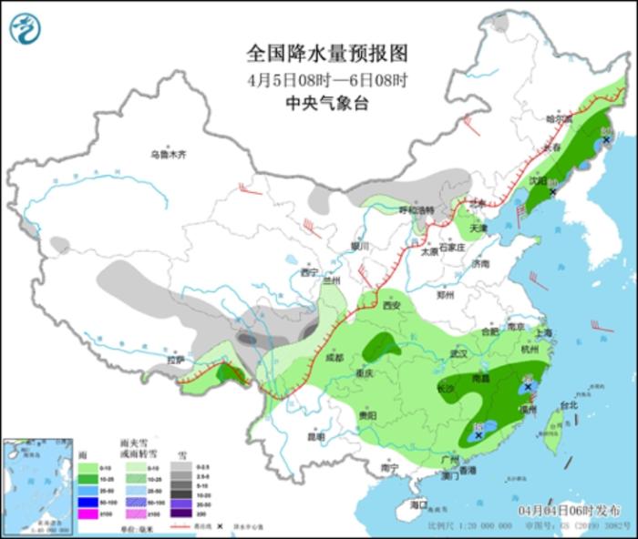 圖3 全國降水量預報圖(4月4日08時-5日08時)