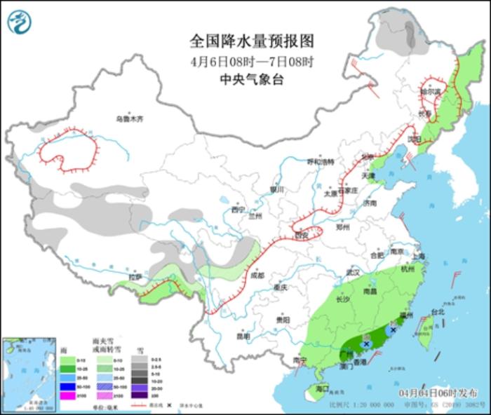 4月5日08時至6日08時,內(nei) 蒙古中部、西藏北部和東(dong) 部、青海南部、川西高原等地部分地區有小到中雪或雨夾雪,局地有大雪。東(dong) 北地區東(dong) 部和南部、西北地區東(dong) 南部、江淮西部、江漢、江南、西南地區東(dong) 部、華南大部、台灣島等地部分地區有小到中雨,其中,吉林東(dong) 部、遼寧東(dong) 部、江西南部、福建北部、廣東(dong) 東(dong) 北部等地局地有大雨(25~45毫米)。內(nei) 蒙古中東(dong) 部、甘肅等地部分地區有4~6級風,其中,甘肅河西部分地區有6~7級風(見圖4)。渤海、渤海海峽、黃海中部和東(dong) 南部海域將有8級、陣風9級的大風,其中渤海和黃海中東(dong) 部的部分海域風力可達9級、陣風10級。