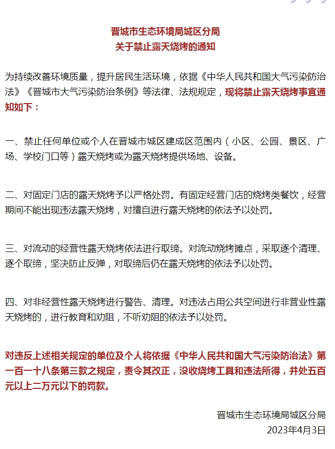 中新網4月10日電 據山西省晉城市生態環境局微信公眾(zhong) 號消息,晉城市生態環境局城區分局10日發布關(guan) 於(yu) 禁止露天燒烤的通知。通知要求: