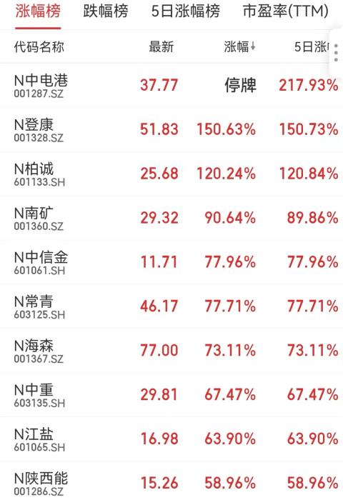 截至發稿時,N中電港停牌,N登康漲幅150.63%,N柏誠漲幅120.24%、N南礦漲幅90.64%,N中信金、N常青、N海森、N中重、N江鹽、N陝西能保持強勢上漲。