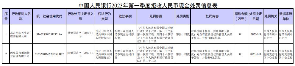 2023年第一季度,人民銀行依法對昌吉州華興(xing) 生態旅遊有限公司、阿克蘇市禾潤物業(ye) 管理有限公司等2家拒收人民幣現金的單位及相關(guan) 責任人作出經濟處罰。