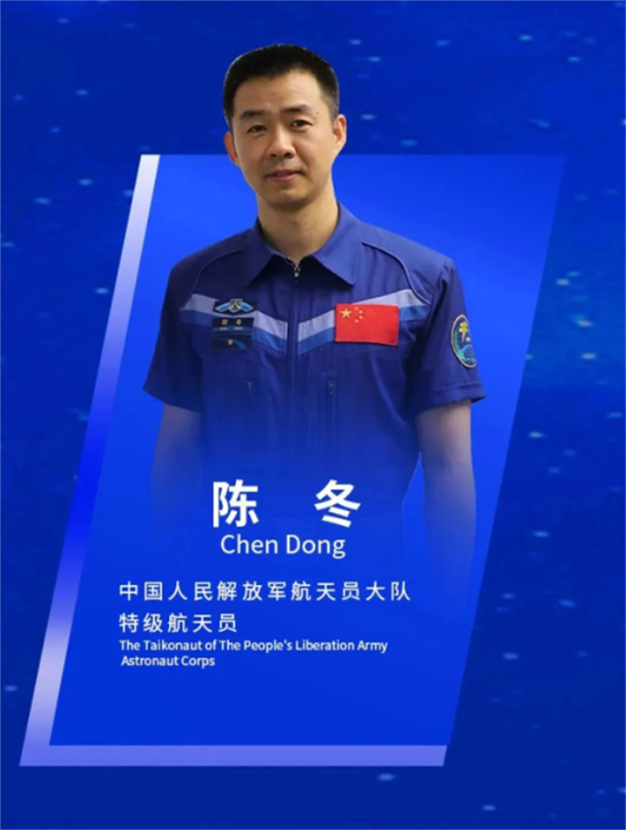 陳冬,中國人民解放軍(jun) 航天員大隊特級航天員,先後執行兩(liang) 次載人航天飛行任務,被黨(dang) 中央、國務院、中央軍(jun) 委授予“英雄航天員”榮譽稱號,並頒發三級航天功勳獎章、二級航天功勳獎章。