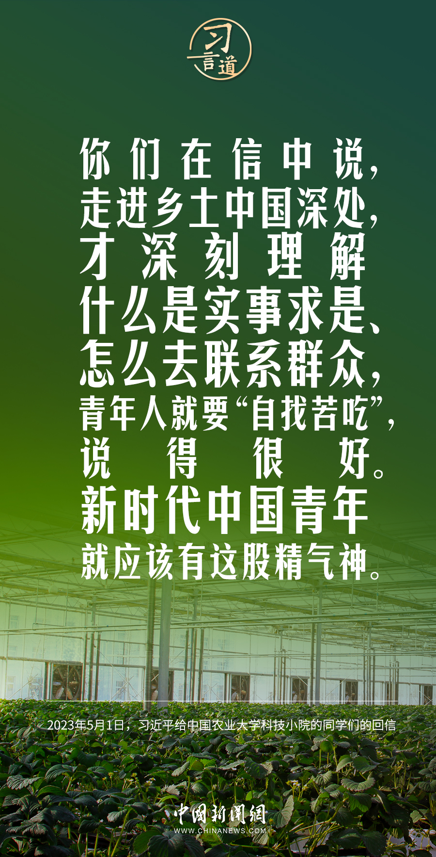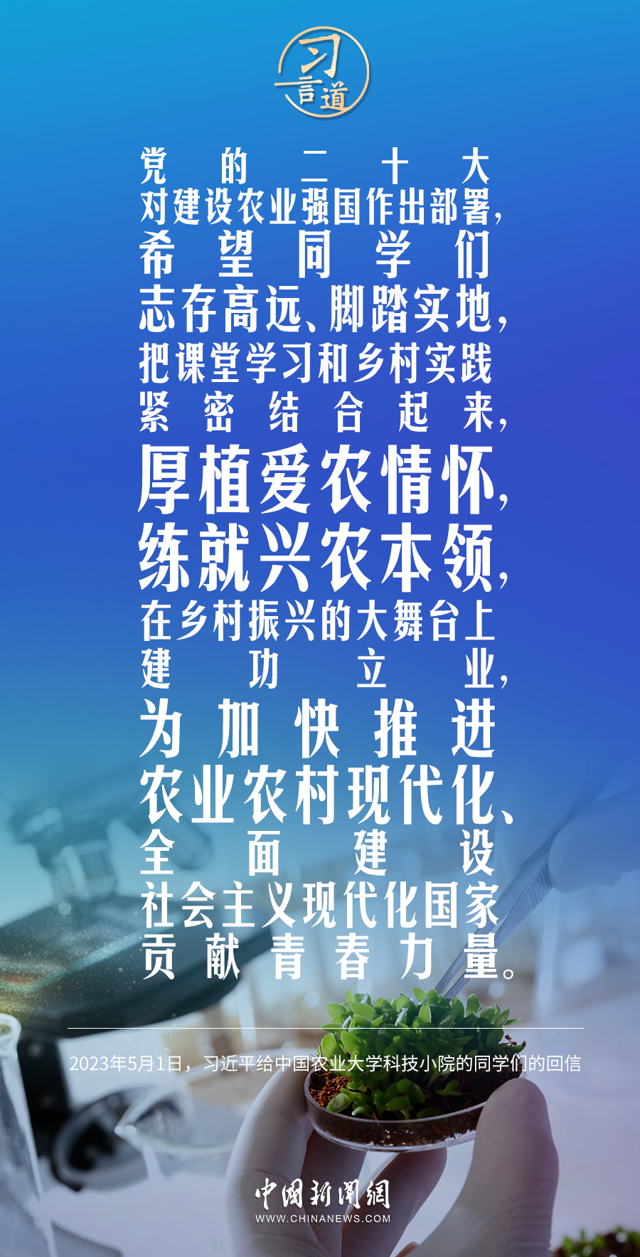 5月1日,中共中央總書(shu) 記、國家主席、中央軍(jun) 委主席習(xi) 近平在給中國農(nong) 業(ye) 大學科技小院同學們(men) 的回信中指出——