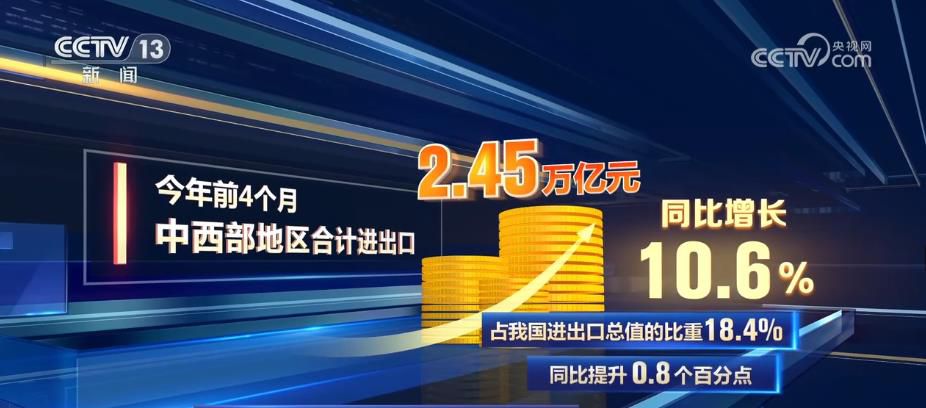 央視網消息:從(cong) 我國外貿區域結構來看,今年前4個(ge) 月,中西部地區合計進出口2.45萬(wan) 億(yi) 元,同比增長10.6%,占我國進出口總值的比重18.4%,同比提升0.8個(ge) 百分點。我國中西部地區進出口快速增長,增速高出全國4.8個(ge) 百分點。