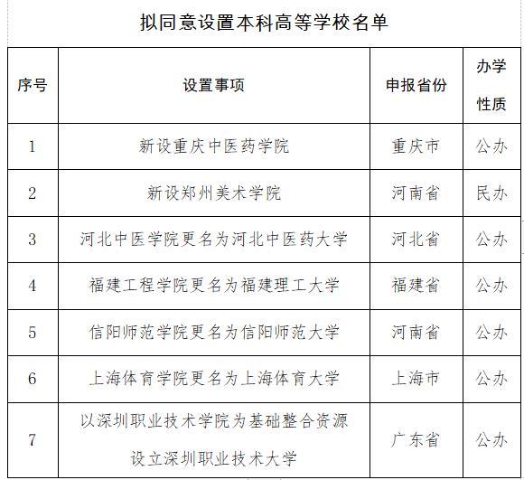 中新網5月22日電 22日,教育部網站發布關(guan) 於(yu) 擬同意設置本科高等學校的公示,經第八屆全國高等學校設置評議委員會(hui) 專(zhuan) 家考察評議,教育部黨(dang) 組會(hui) 議審議,擬同意設置重慶中醫藥學院等7所學校,現予公示。公示時間為(wei) 2023年5月22日至5月26日。
