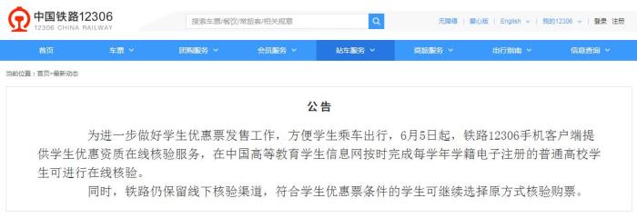 同時,鐵路仍保留線下核驗渠道,符合學生優(you) 惠票條件的學生可繼續選擇原方式核驗購票。