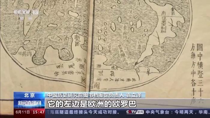 中國曆史研究院圖書(shu) 檔案館負責人 袁立澤:這幅圖是16世紀末,西方第一批來華傳(chuan) 教士利瑪竇主持繪製的。把西方當時先進的製圖技術帶到了中國,同時他有意識地吸收了中國的製圖經驗和理念。今天我們(men) 所熟悉的七大洲四大洋,在圖中應該說已經標示出了六大洲和三大洋,就是亞(ya) 洲的亞(ya) 細亞(ya) 。它的左邊是歐洲的歐羅巴,南麵就是今天的非洲叫利未亞(ya) ,改變了以往以歐洲為(wei) 中心的繪圖方式。它是中西文明交流互鑒的一個(ge) 結晶和有力見證。