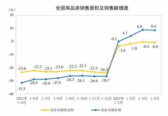 1—5月份,商品房銷售麵積46440萬(wan) 平方米,同比下降0.9%,其中住宅銷售麵積增長2.3%。商品房銷售額49787億(yi) 元,增長8.4%,其中住宅銷售額增長11.9%。