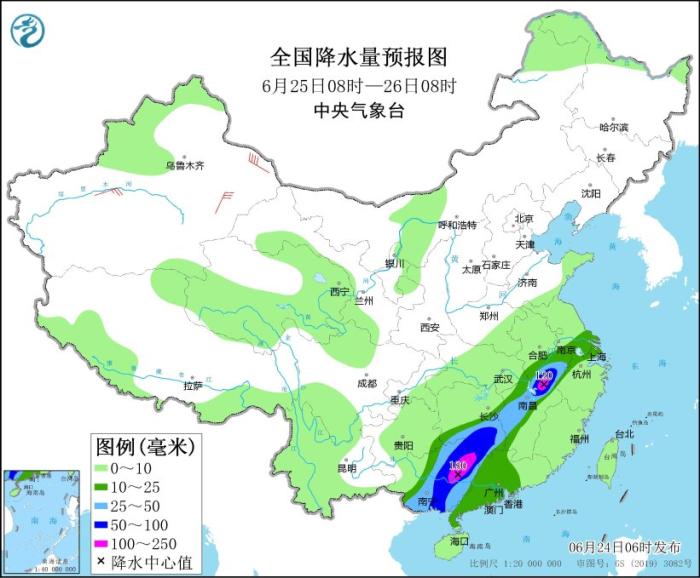 6月24日08時至25日08時,蘇皖南部、上海、浙江北部和西部、福建西北部、江西大部、湖南南部、廣西大部、廣東(dong) 中西部、雲(yun) 南南部等地部分地區有大到暴雨,其中,江蘇東(dong) 南部、上海東(dong) 部、廣西中部和南部沿海、廣東(dong) 北部等地局部地區有大暴雨(100~160毫米)。