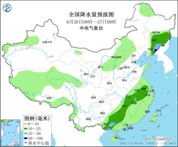 全國降水量預報圖(6月25日08時-26日08時)