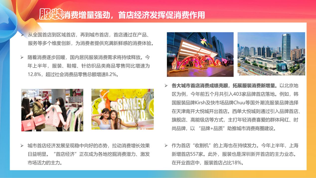 在服裝消費方麵,隨著消費逐步回暖,國內(nei) 居民服裝消費需求將持續釋放。以北京地區為(wei) 例,今年前五個(ge) 月共引入403家品牌首店落地。例如,韓國服裝品牌Kirsh及快市場品牌Chuu等國外潮流服裝品牌選擇在天津南開大悅城開出首店。西單大悅城則通過引入品牌首店、旗艦店、高能級店等方式,主打年輕消費喜愛的群體(ti) 網紅、時尚品牌,以“品牌+品質”助推城市消費商圈建設。《報告》認為(wei) ,“首店經濟”正在成為(wei) 各地挖掘消費潛力、激發市場活力的主力。