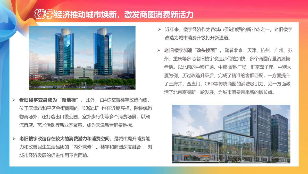 老舊樓宇改造存在較大的消費潛力和消費空間,是城市提升消費能力和改善民生生活品質的“內(nei) 外兼修”。《報告》梳理指出,隨著北京、天津、杭州、廣州、蘇州、重慶等多地老舊樓宇改造步伐的加快,多個(ge) 商圈存量資源被盤活。以北京的中糧廣場、中糧·置地廣場、匯京雙子座、中糖大廈為(wei) 例,通過舊改提升、輕(中)資產(chan) 輸出等方式,打造高端商務地標,完成了精準的客群匹配,一方麵提升了王府井、西直門、CBD等傳(chuan) 統商圈的消費吸引力,另一方麵激活了北京商圈新一輪發展,推動片區重構和能級提升,為(wei) 城市消費帶來新的增長點。