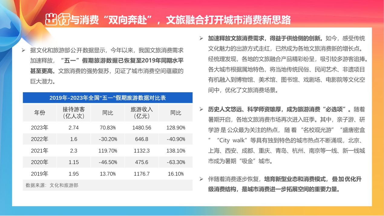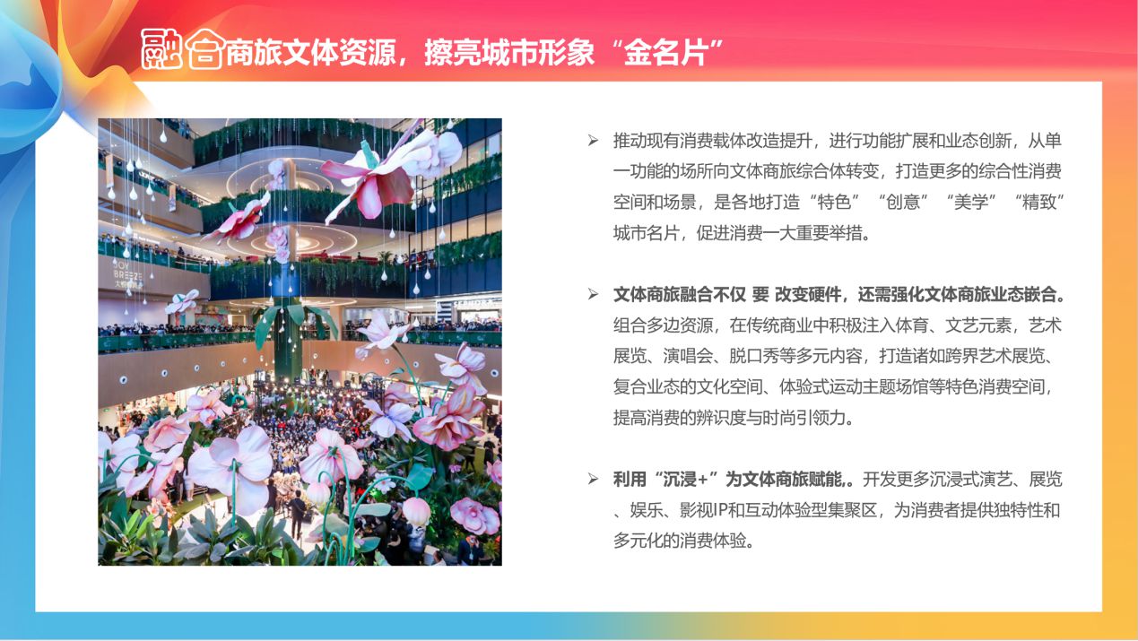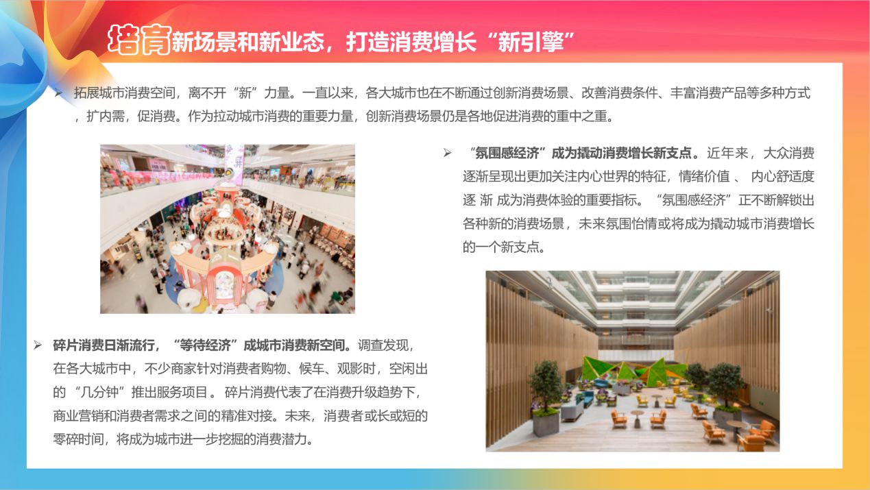 《報告》認為(wei) ,推動現有消費載體(ti) 改造提升,進行功能擴展和業(ye) 態創新,從(cong) 單一功能的場所向文體(ti) 商旅綜合體(ti) 轉變,打造更多的綜合性消費空間和場景,是各地打造“特色”“創意”“美學”“精致”城市名片,促進消費一大重要舉(ju) 措。