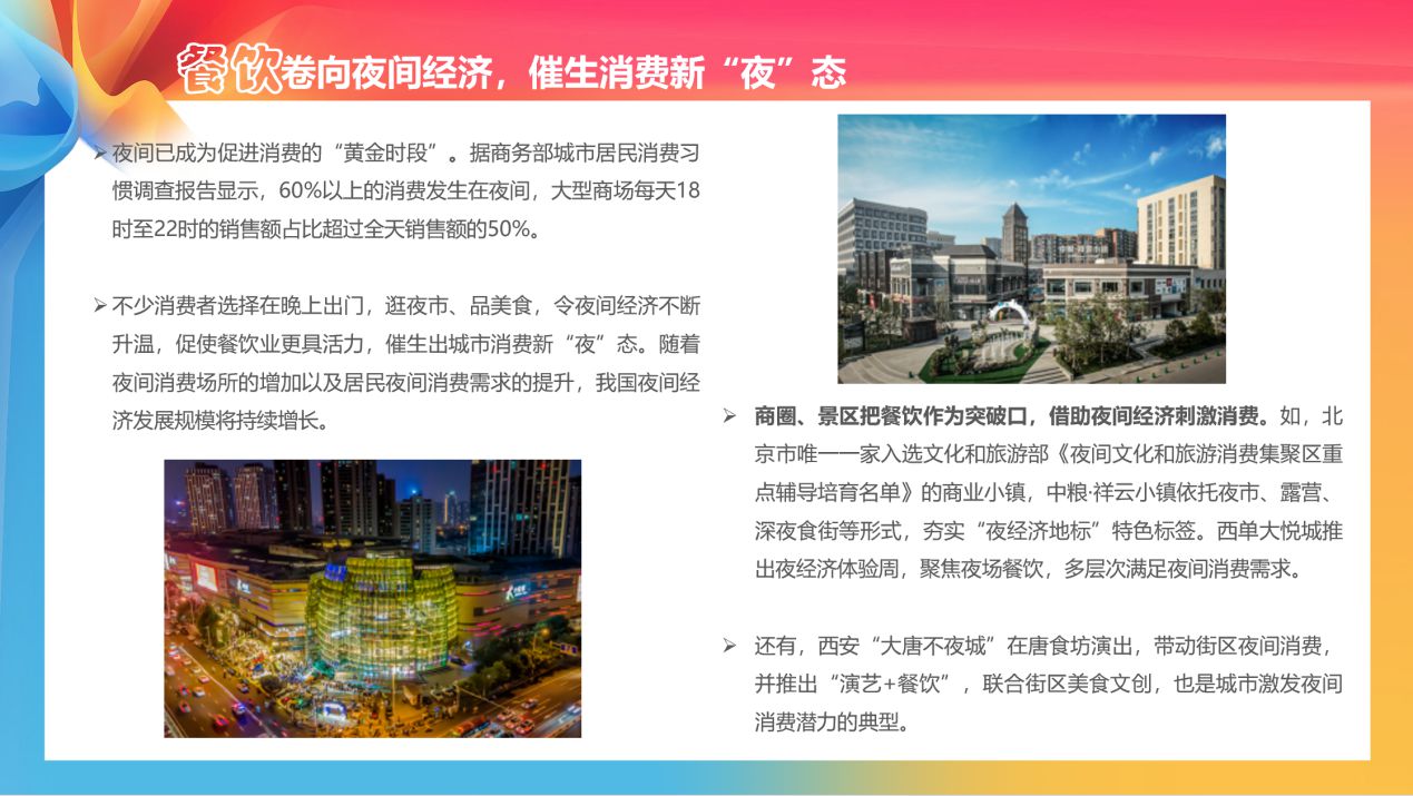 在餐飲消費方麵,隨著夜間消費場所的增加以及居民夜間消費需求的提升,我國夜間經濟發展規模將持續增長。例如,北京市唯一一家入選文化和旅遊部《夜間文化和旅遊消費集聚區重點輔導培育名單》的商業(ye) 小鎮,中糧·祥雲(yun) 小鎮依托夜市、露營、深夜食街等形式,構建了“商圈+生活圈+夜經濟”的消費重地,榮獲北京十大商業(ye) 品牌、消費季品牌榜“十大文化消費地標”。西安“大唐不夜城”在唐食坊演出,帶動街區夜間消費,並推出“演藝+餐飲”,聯合街區美食文創,也是城市激發夜間消費潛力的典型。《報告》認為(wei) ,隨著夜間消費場所的增加以及居民夜間消費需求的提升,我國夜間經濟發展規模將持續增長。