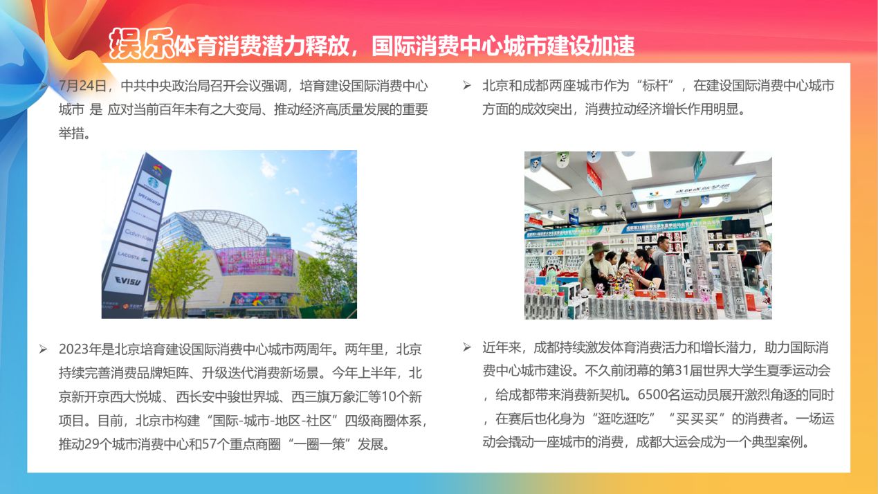 在娛樂(le) 體(ti) 育消費方麵,北京、成都兩(liang) 座城市作為(wei) “標杆”,在建設國際消費中心城市方麵的成效突出,消費拉動經濟增長作用明顯。以北京為(wei) 例,2023年是北京培育建設國際消費中心城市兩(liang) 周年。兩(liang) 年裏,北京持續完善消費品牌矩陣、升級迭代消費新場景。今年上半年,北京新開京西大悅城、西長安中駿世界城、西三旗萬(wan) 象匯等10個(ge) 新項目。目前,北京市構建“國際-城市-地區-社區”四級商圈體(ti) 係,推動29個(ge) 城市消費中心和57個(ge) 重點商圈“一圈一策”發展。
