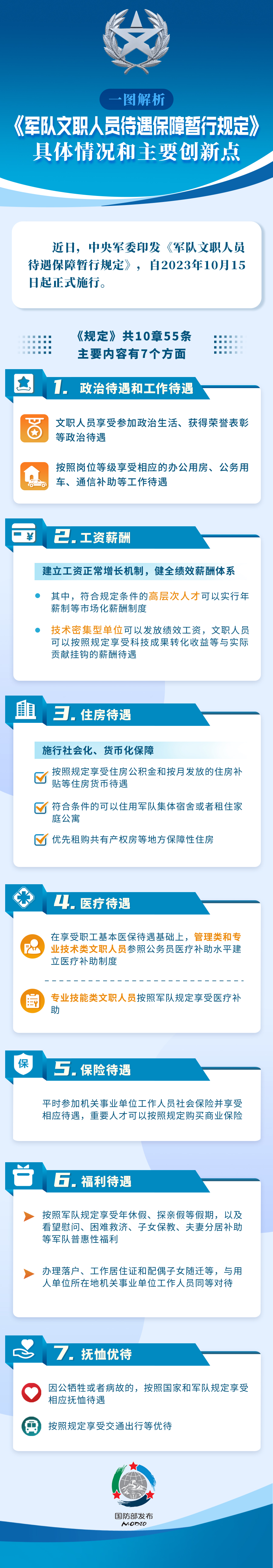 六是福利待遇。按照軍(jun) 隊規定享受年休假、探親(qin) 假等假期,以及看望慰問、困難救濟、子女保教、夫妻分居補助等軍(jun) 隊普惠性福利。辦理落戶、工作居住證和配偶子女隨遷等,與(yu) 用人單位所在地機關(guan) 事業(ye) 單位工作人員同等對待。