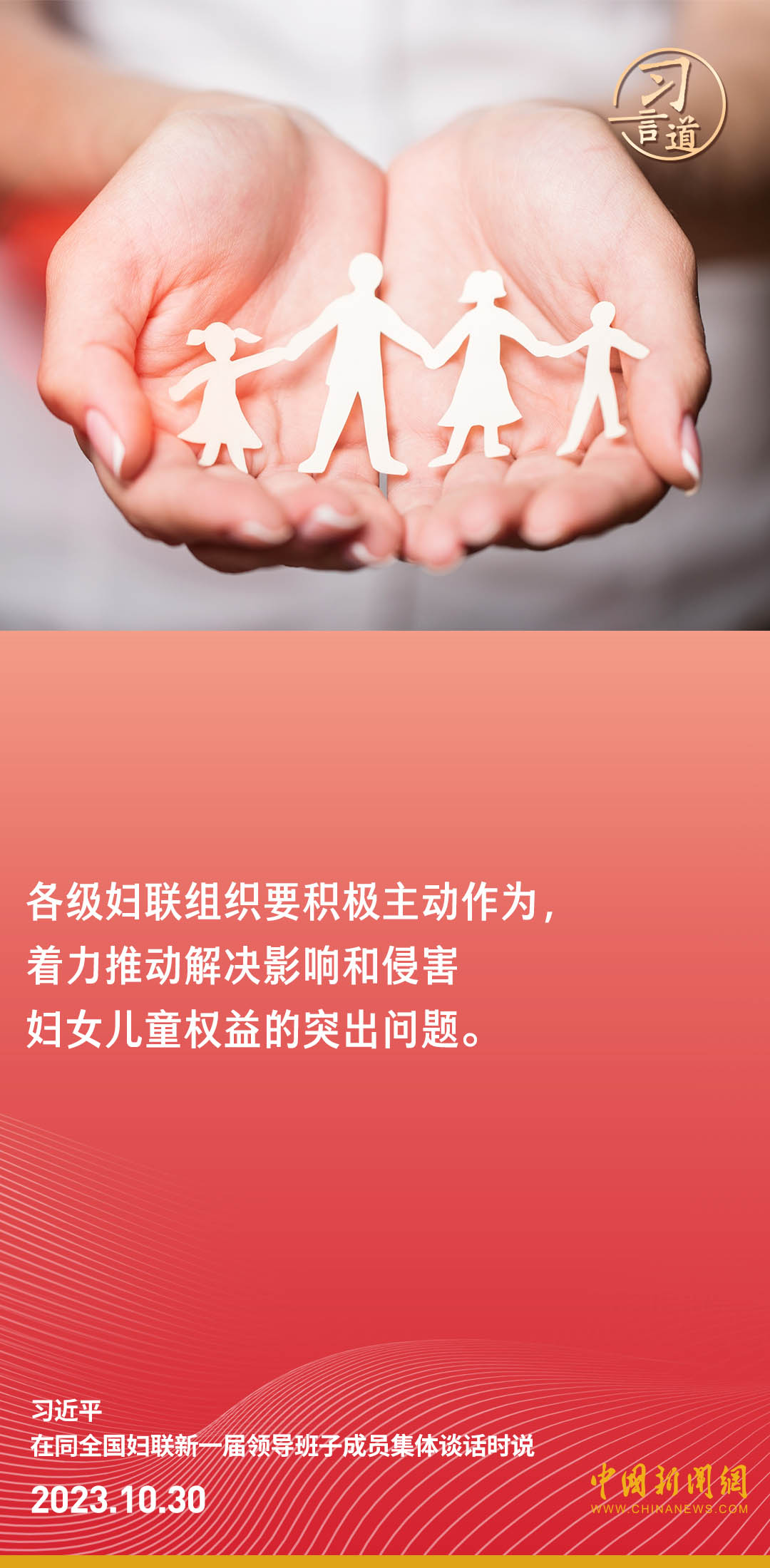 中共中央總書(shu) 記、國家主席、中央軍(jun) 委主席習(xi) 近平30日下午在中南海同全國婦聯新一屆領導班子成員集體(ti) 談話並發表重要講話。習(xi) 近平強調——