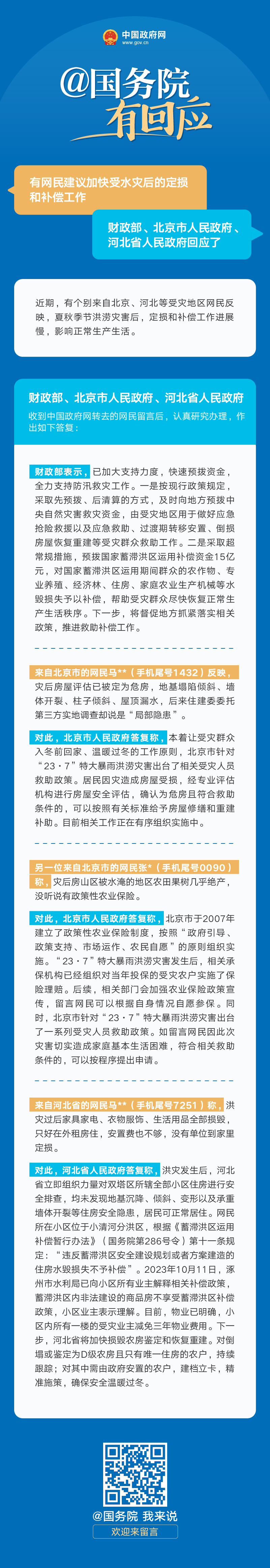 財政部、北京市人民政府、河北省人民政府答網民關於“建議加快受水災後的定損和補償工作”的留言