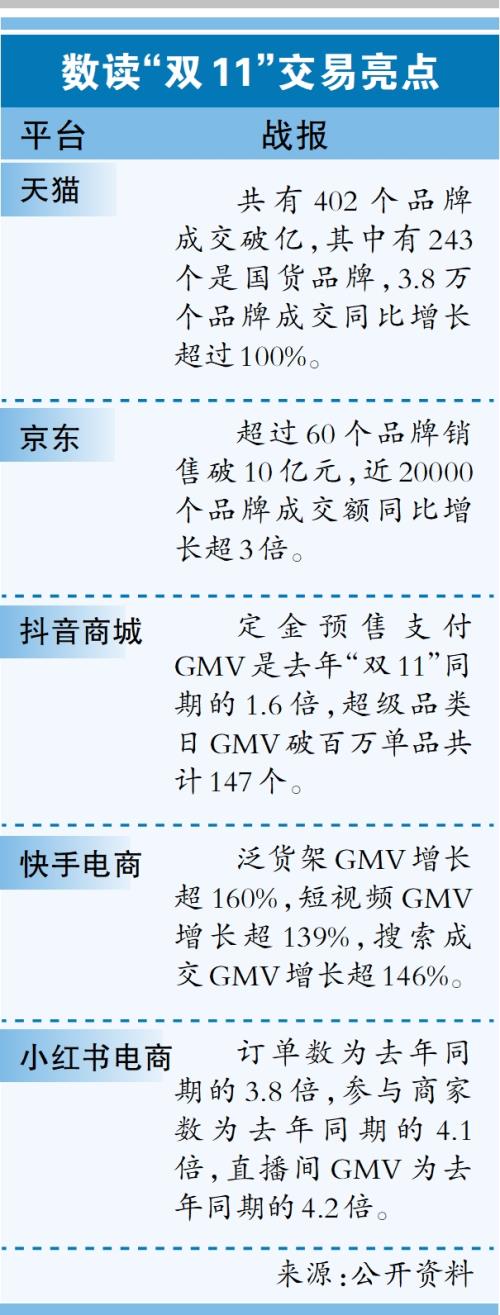 淘天數據顯示,今年天貓“雙11”用戶規模和商家規模顯著增長,其中全周期累計訪問用戶數超8億(yi) ,達到曆史峰值。截至11月11日零點,共有402個(ge) 品牌成交破億(yi) ,3.8萬(wan) 個(ge) 品牌成交同比增長超過100%。“官方立減”商品訂單量超2.1億(yi) ,“天天低價(jia) ”商品訂單量近9000萬(wan) 。京東(dong) 方麵則稱,截至11月11日23:59,成交額、訂單量、用戶數齊創新高,“9塊9包郵”“京東(dong) 百億(yi) 補貼”“京東(dong) 秒殺”成為(wei) “增量場”,累計超過60個(ge) 品牌銷售破10億(yi) 元,近20000個(ge) 品牌成交額同比增長超3倍,新商家成交單量環比增長超5倍。