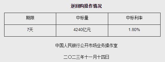 中新網11月14日電 據央行網站消息,為(wei) 維護銀行體(ti) 係流動性合理充裕,2023年11月14日人民銀行以利率招標方式開展了4240億(yi) 元逆回購操作,中標利率1.80%,期限為(wei) 7天。具體(ti) 情況如下: